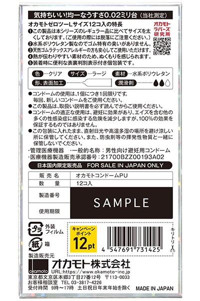 HOME> コンドーム > サイズ(小・大) > オカモトゼロツー うすさ均一0.02 Lサイズ(12個入り)